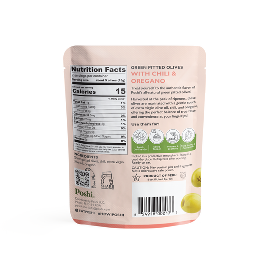 Poshi Snack - Chili & Oregano Pitted Green Olives 1.1oz/10ct