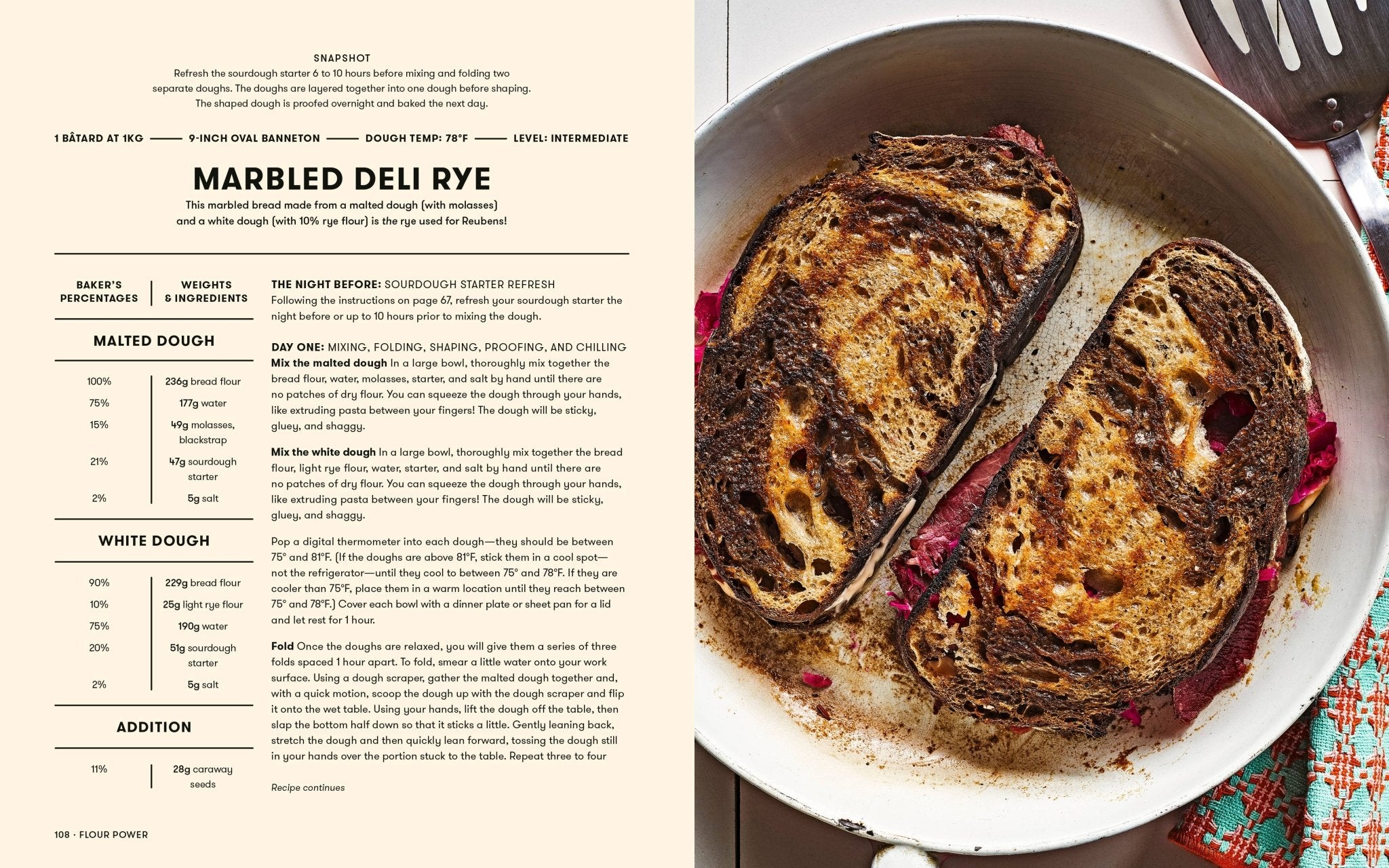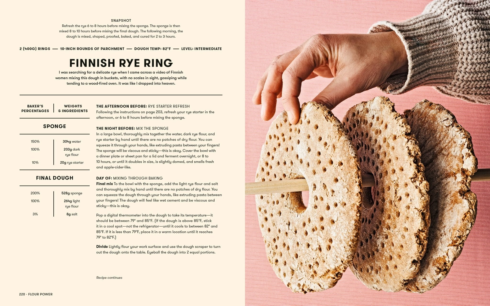 Flour Power is divided into two parts: the workshop and the recipes. In the workshop, bakers learn all about flour and how to build strength in dough by hand, read a bread formula, and troubleshoot sluggish starters and unruly doughs. The recipes section is divided into chapters by flour and bread type. There’s a chapter on sourdough using white flour (olive loaf; milk bread), whole wheat desem (Cinnamon-Raisin Desem; Aloo Paratha), and rye (honey and aniseed rye; mountain rye). And like any good professor, Tara offers a chapter on extra credit too, with recipes like Overnight Waffles, Sourdough Pie Crust, and Cheddar Crackers to make from “discard” (the starter you discard before “feeding” it).