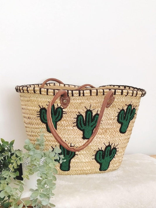 • Cactus Market Basket Straw Bag Handmade with Leather