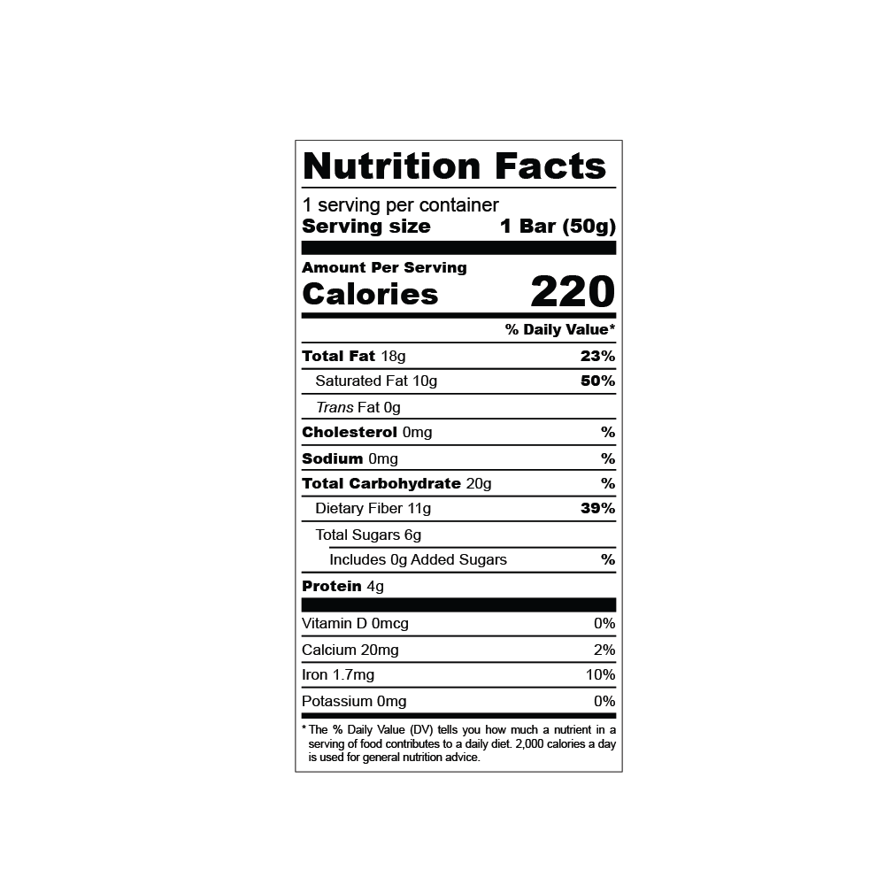 72% premium cacao infused with meidum roast organic delicious coffee beans providing the perfect combo. ( Espresso beans have a crunch to them but they are still subtle enough to taste the chocolate very well ) Ingredients: Organic Cacao, Organic Coffee Beans, Organic Dates, Organic Cacao Butter.