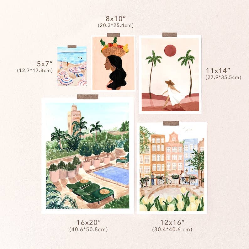 Our print designs are hand painted by Sabina Fenn using gouache and watercolor mediums. Sabina finds inspiration in the warmth of summers and tranquil moments in daily life. Her unique approach to femme-chic approach to illustration makes for peaceful, vibrant and lush artwork.