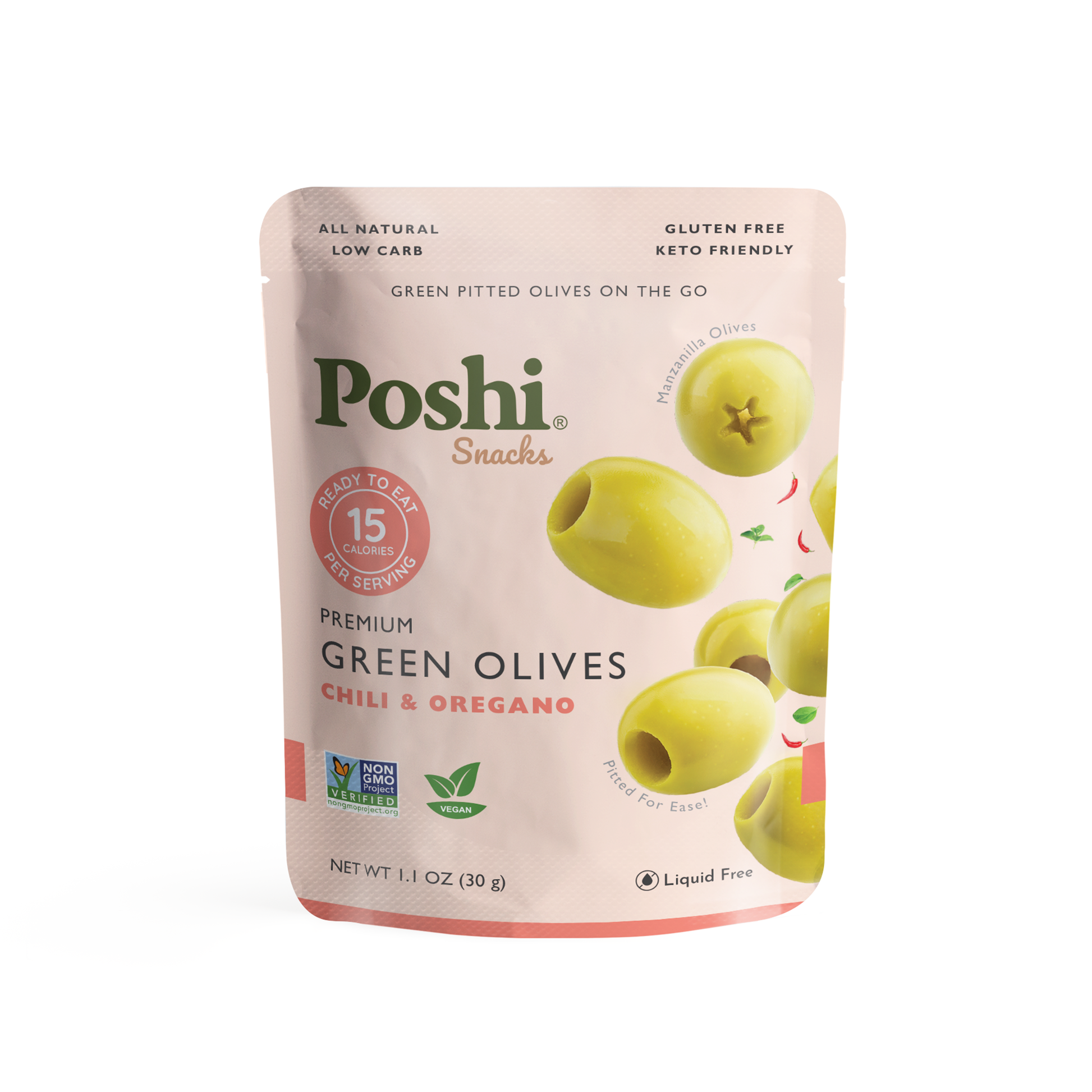 Poshi Snack - Chili & Oregano Pitted Green Olives 1.1oz/10ct