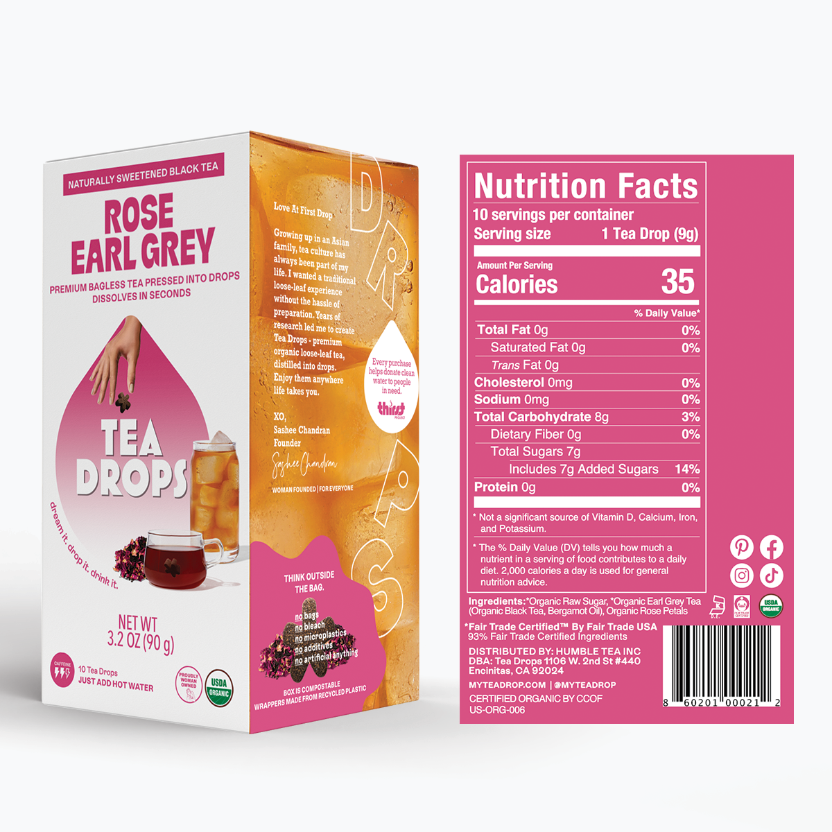 This organic tea feels like a stroll through an English country garden: fresh, fragrant, and comforting, with a touch of class. Fragrant rose petals meet aromatic bergamot to create a bold and beautiful flavor — the perfect pick-me-up for morning or night. Great for holiday gift giving: corporate gifting; client gifting, gift baskets. Tea Drops are loose leaf tea delicately ground and pressed into drops. Our bagless tea elevates your teatime with high-quality and flavorful brews.