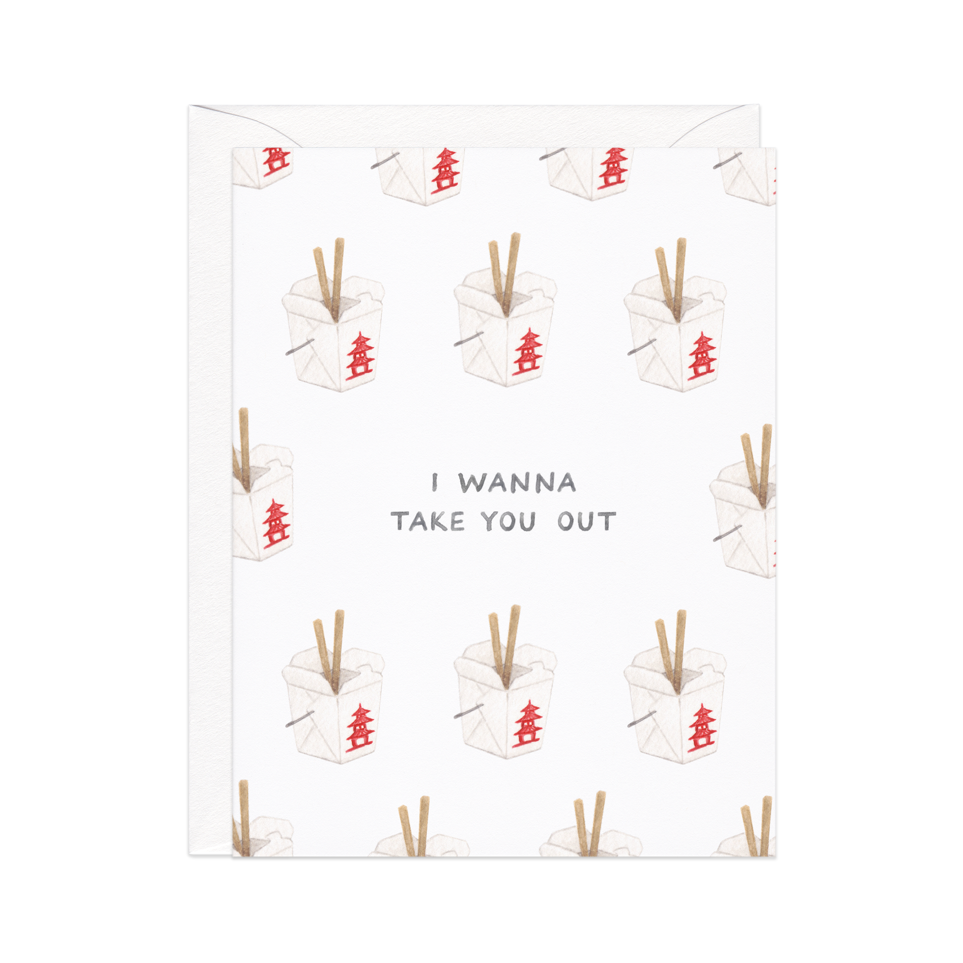 This love card features a fun takeout box pattern, paired with a funny food-inspired pun. Great for: Valentine's Day, Galentine's Day, anniversaries, foodies